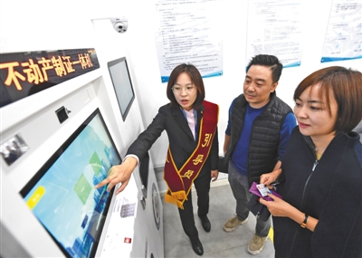 昨日,朝陽區不動產登記事務中心,工作人員講解不動產制證一體機的使用方法。 新京報記者 吳寧 攝