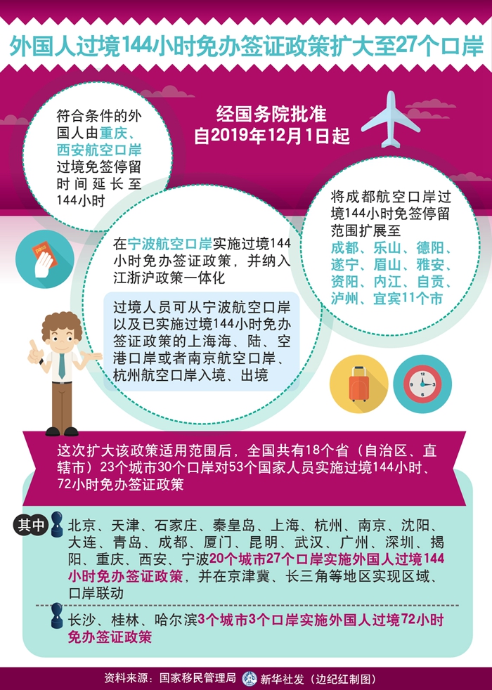 新華社北京10月23日電 記者23日從國家移民管理局新聞發(fā)布會(huì)獲悉,隨著我國對(duì)外開放不斷深入,中外交流不斷深化,為進(jìn)一步促進(jìn)經(jīng)濟(jì)社會(huì)發(fā)展和中外人員往來,經(jīng)國務(wù)院批準(zhǔn),自2019年12月1日起,符合條件的外國人由重慶、西安航空口岸過境免簽停留時(shí)間延長(zhǎng)至144小時(shí);在寧波航空口岸實(shí)施過境144小時(shí)免辦簽證政策,并納入江浙滬政策一體化,過境人員可從寧波航空口岸以及已實(shí)施過境144小時(shí)免辦簽證政策的上海海、陸、空港口岸或者南京航空口岸、杭州航空口岸入境、出境;將成都航空口岸過境144小時(shí)免簽停留范圍擴(kuò)展至成都、樂山、德陽、遂寧、眉山、雅安、資陽、內(nèi)江、自貢、瀘州、宜賓11個(gè)市。