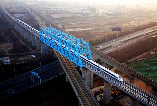 蘭新高鐵動(dòng)車組列車在新疆哈密特大橋上行駛 (蔡增樂(lè) 攝)