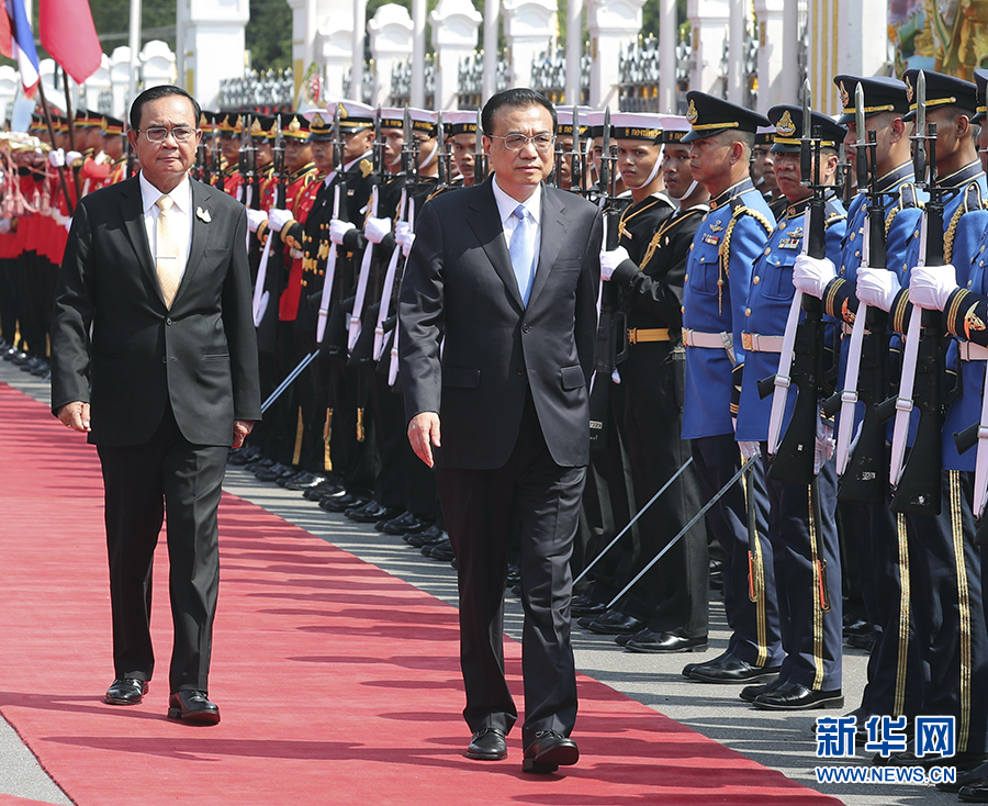 會(huì)談前,巴育在總理府前廣場為李克強(qiáng)舉行隆重歡迎儀式。兩國總理登上檢閱臺(tái),軍樂隊(duì)高奏中泰兩國國歌。李克強(qiáng)在巴育陪同下檢閱了儀仗隊(duì)。