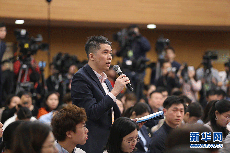 十三屆全國人大二次會議新聞中心3月9日(星期六)10時30分在梅地亞中心新聞發布廳舉行記者會,邀請商務部部長鐘山、副部長兼國際貿易談判副代表王受文、副部長錢克明就“促進形成強大國內市場 推動全方位對外開放”相關問題回答中外記者提問。圖為中國日報記者提問。新華網/中國政府網 劉廈 攝