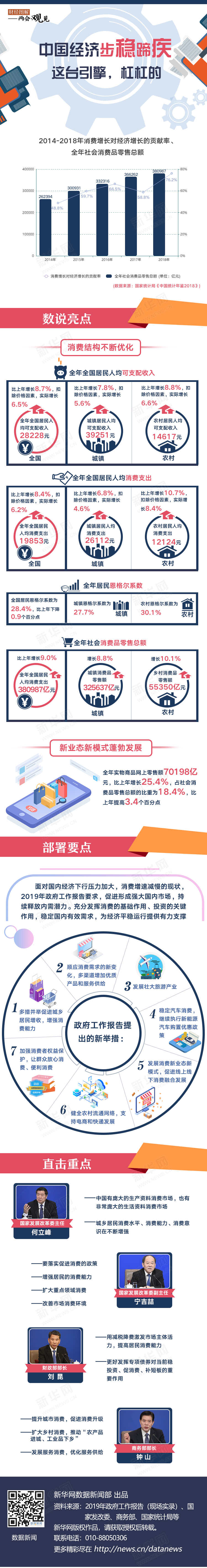 新華網北京3月9日電(劉緒堯 何凡) 2018年消費的增長對經濟增長的貢獻達到76.2%,已連續五年成為拉動經濟增長的主引擎,消費結構不斷優化,教育、文化、娛樂、醫療保健等服務消費支出比例穩步提高。當前,我國整個國民經濟13.6萬億美元的總量當中,消費總量已超過8萬億美元。未來如何更充分地發揮消費的基礎作用?且看政府工作報告如何部署。