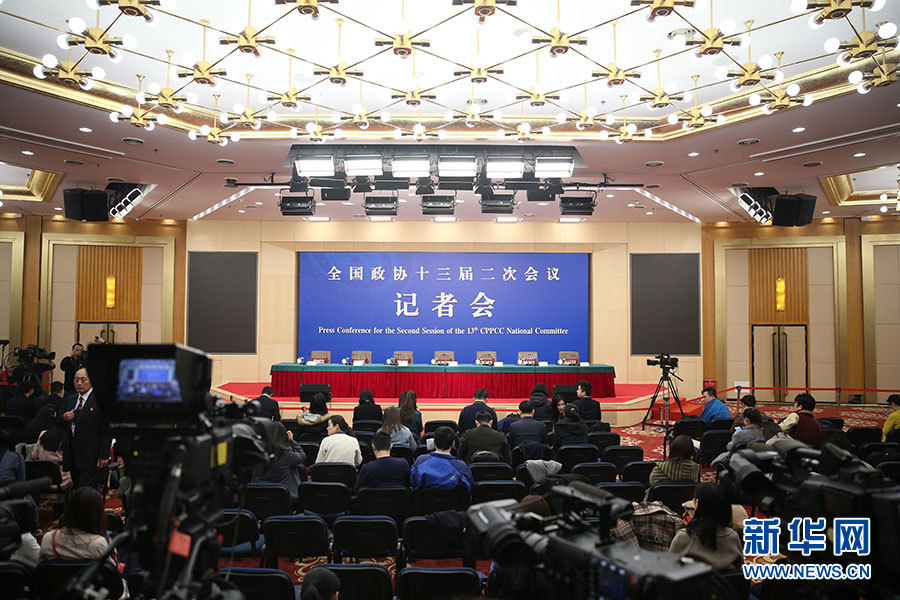 全國政協十三屆二次會議3月10日(星期日)上午8:45在梅地亞兩會新聞中心舉行記者會,邀請5位政協委員就“新時代政協履職”回答記者提問。圖為記者會現場。新華網、中國政府網進行現場直播。新華網/中國政府網 劉廈攝