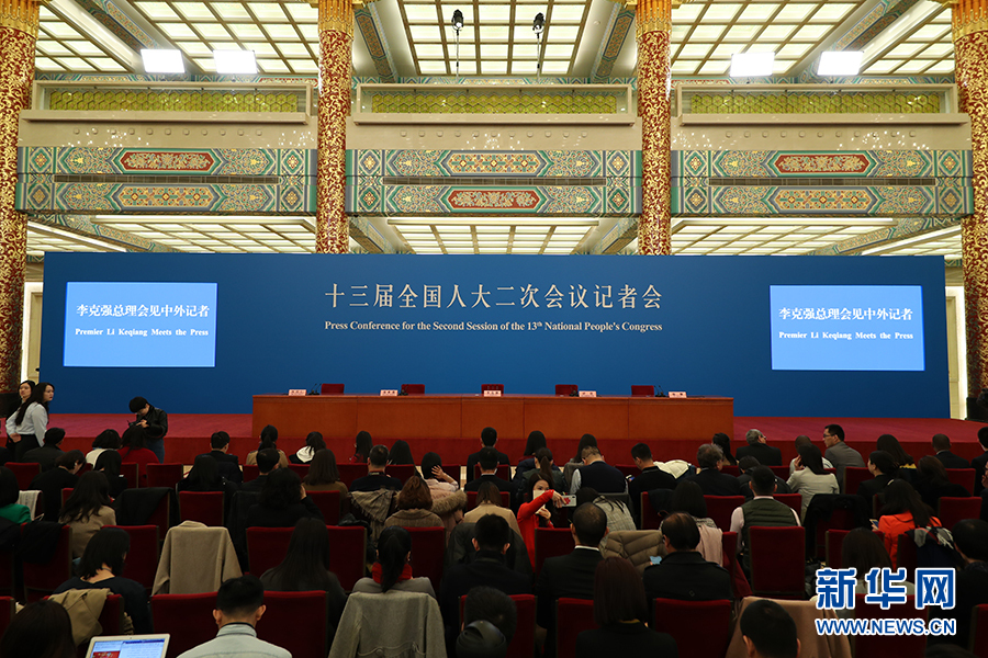 3月15日上午十三屆全國人大二次會議閉幕后,國務(wù)院總理李克強在人民大會堂三樓金色大廳會見采訪十三屆全國人大二次會議的中外記者并回答記者提出的問題。圖為記者會現(xiàn)場。新華網(wǎng)/中國政府網(wǎng) 劉廈 攝