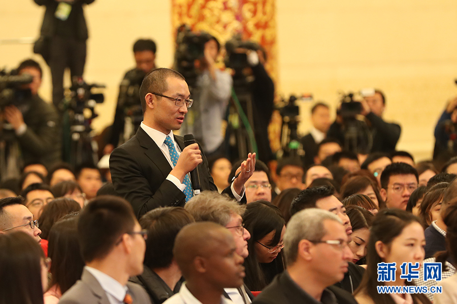 ??? 3月15日上午十三屆全國人大二次會議閉幕后,國務院總理李克強在人民大會堂三樓金色大廳會見采訪十三屆全國人大二次會議的中外記者并回答記者提出的問題。圖為彭博社記者提問。新華網(wǎng)/中國政府網(wǎng)?陳杰 攝