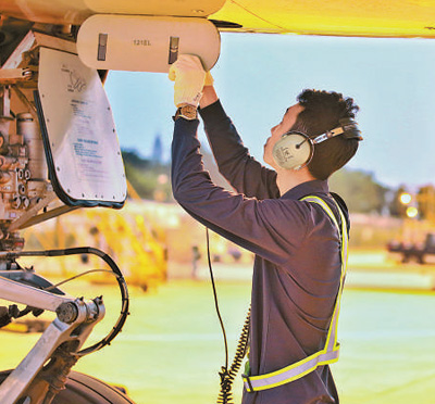 10日,機(jī)務(wù)人員進(jìn)行起飛前的各項(xiàng)檢查。當(dāng)日,海口美蘭機(jī)場(chǎng)飛往北京大興機(jī)場(chǎng)的首個(gè)航班順利起航。朱榮鵬 紀(jì)巧珠攝影報(bào)道(影像中國(guó))
