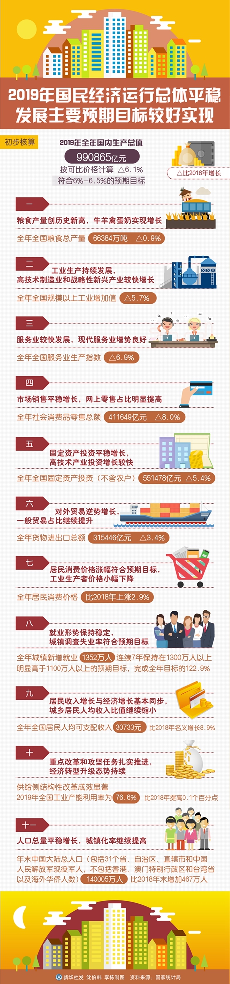 “國民經濟運行總體平穩、穩中有進,發展質量穩步提升,主要預期目標較好實現,為全面建成小康社會奠定堅實基礎?!眹野l展改革委副主任兼國家統計局局長寧吉喆評價說。