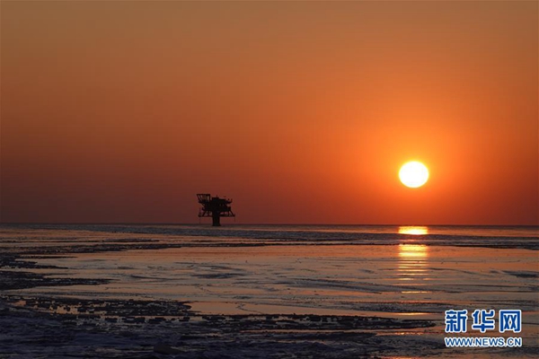 中海油錦州9-3采油平臺落日下的浮冰(1月13日攝)。新華社發(安磊 攝)