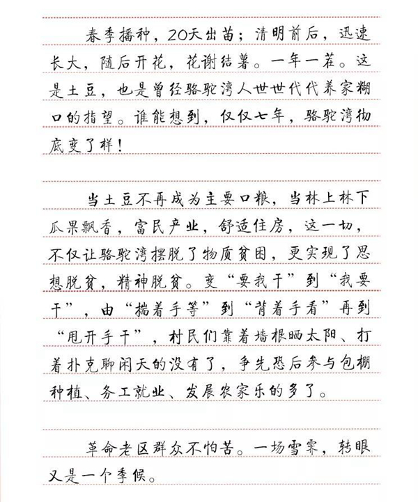 回憶起當時的情景,顧寶青至今心里暖暖。分紅這天,顧寶青特意蒸了一鍋土豆,剛從屜上揭下,熱氣騰騰的,像極了駱駝灣現在的好生活……