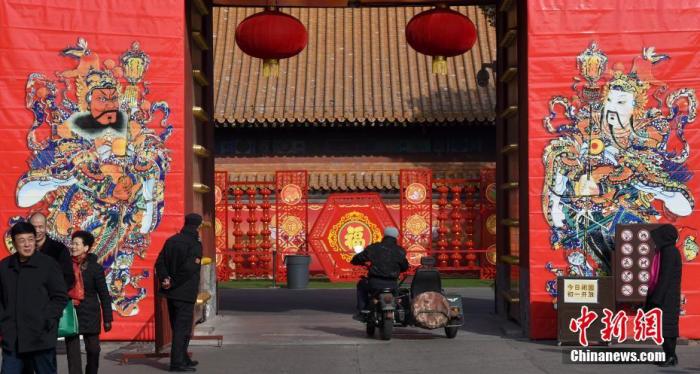 資料圖:農(nóng)歷除夕當(dāng)天,北京地壇公園入口被大幅門神和大紅燈籠等裝飾一新。中新社記者 侯宇 攝