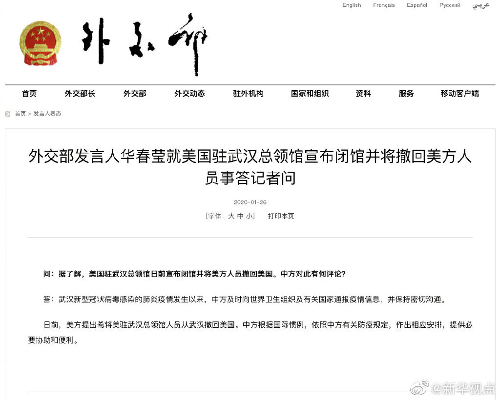 外交部發言人就美國駐武漢總領館宣布閉館并將撤回美方人員事答記者問-新華網