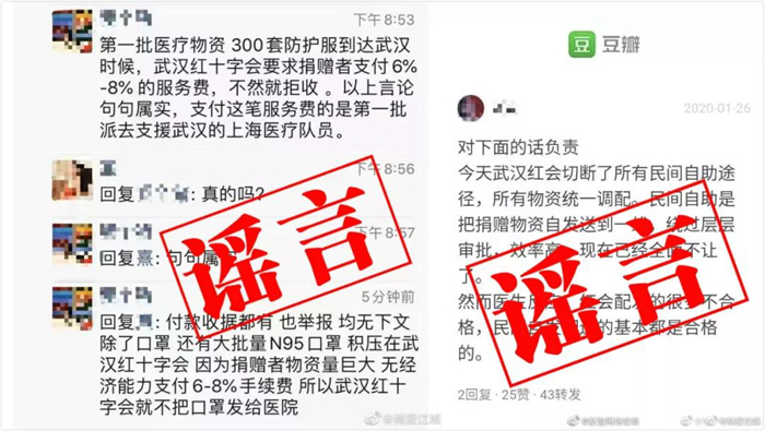 武漢市紅十字會呼吁廣大網友,不要讓謠言玷污了各界愛心企業和愛心人士的善意之舉,疫情面前,不信謠、不傳謠,眾志成城,共渡難關。