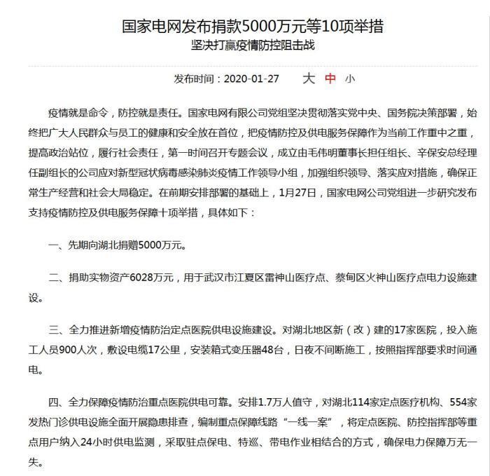在前期安排部署的基礎上,1月27日,國家電網(wǎng)公司黨組進一步研究發(fā)布支持疫情防控及供電服務保障十項舉措,具體如下: