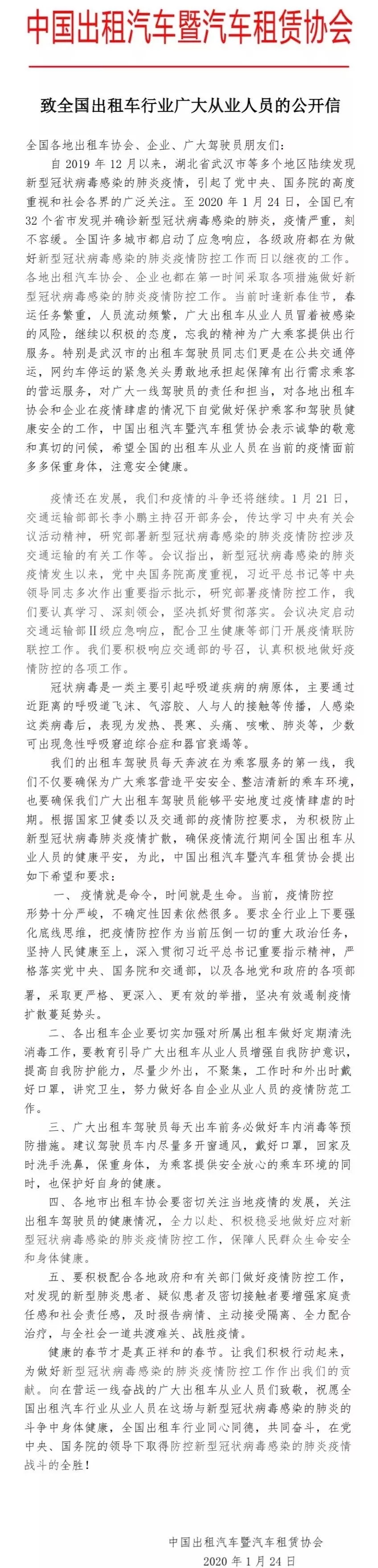近日,中國出租汽車暨汽車租賃協會發布公開信,倡議全國出租車行業廣大從業人員把疫情防控作為當前壓倒一切的重大政治任務。出租車駕駛員每天出車前務必做好車內消毒等預防措施,采取更嚴格、更深入、更有效的舉措,堅決有效遏制疫情擴散蔓延勢頭。?