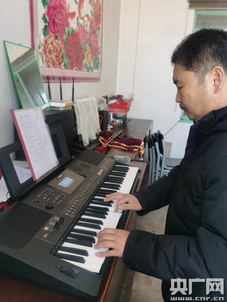 崔建存彈電子琴,琴架上有他從網上自己手抄的20多頁歌曲簡譜(央廣記者 柴華 攝)