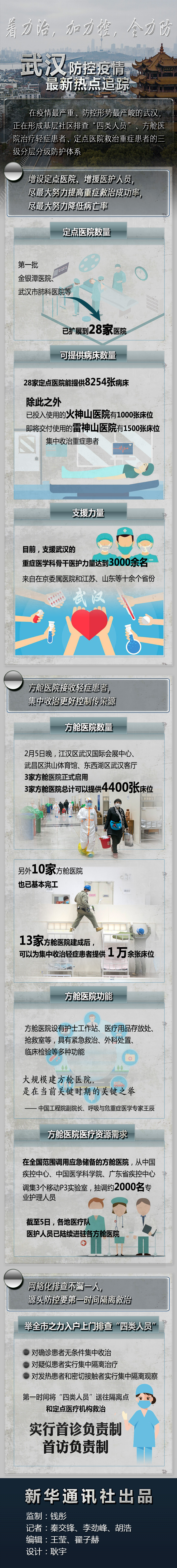除了定點醫(yī)院,已投入使用的火神山醫(yī)院有1000張床位,即將交付使用的雷神山醫(yī)院有1500張床位集中收治重癥患者。