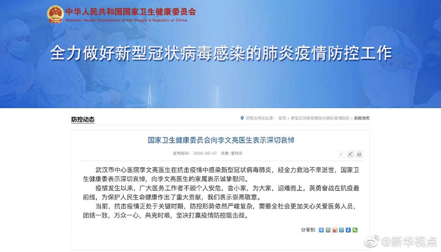 國家衛生健康委員會向李文亮醫生表示深切哀悼-新華網