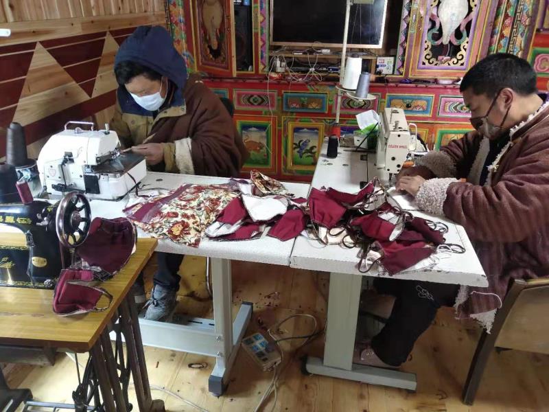 2月5日,四川省金川縣毛日鄉熱它村活動室里一片忙碌景象,紉、剪布料、消毒......二十幾個村民正在有序地縫制口罩。