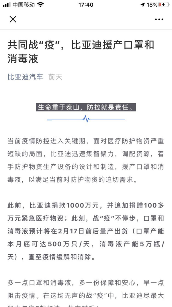 2月8日,“比亞迪汽車”微信號一篇《共同戰(zhàn)“疫”,比亞迪援產(chǎn)口罩和消毒液》引發(fā)網(wǎng)友關(guān)注,文章稱,比亞迪將在2月17日前后預(yù)計量產(chǎn)出貨口罩和消毒液(口罩產(chǎn)能本月底可達500萬只/天,消毒液產(chǎn)能5萬瓶/天),直至疫情緩解和消除。