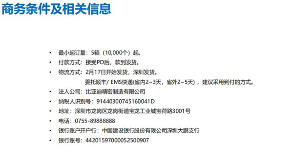 與此同時,《比亞迪賣口罩了》pdf文件也在網(wǎng)上流傳,文件內(nèi)容顯示,口罩制造的法人公司為比亞迪精密制造有限公司,最小起訂量為5箱(10000個)起,2月17日開始從深圳發(fā)貨。快遞委托順豐/ EMS快遞(省內(nèi)2-3天,省外2-5天) 。