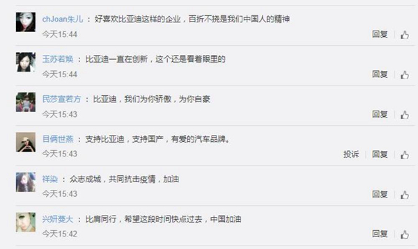 對于比亞迪汽車跨界造口罩一事,網(wǎng)友紛紛表示:“眾志成城,共同抗擊疫情”“百折不撓是中國人的精神”“希望這段時間快點過去,中國加油”。