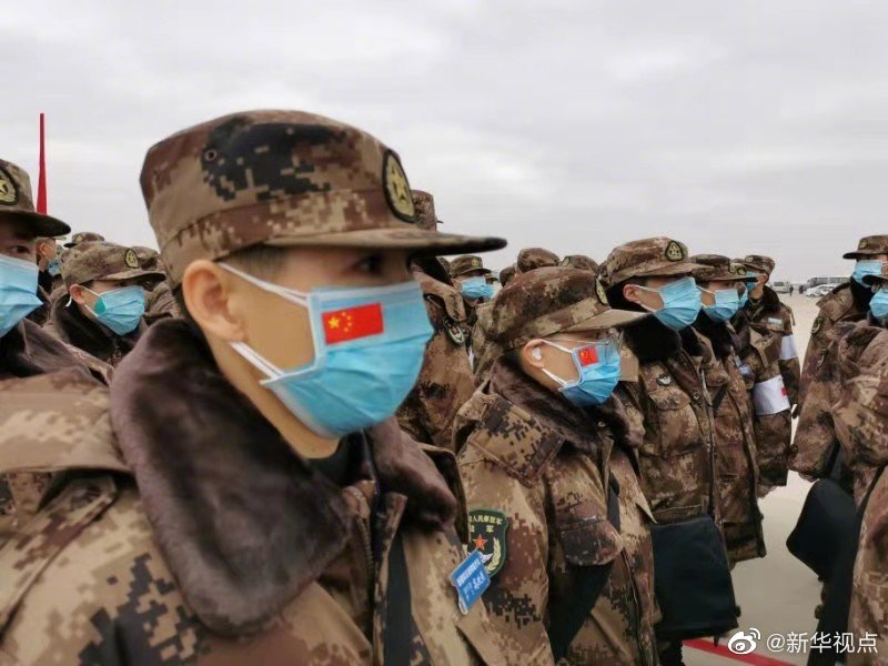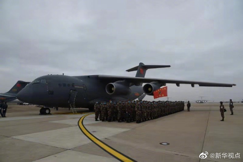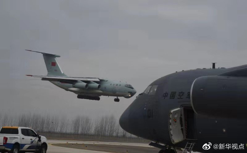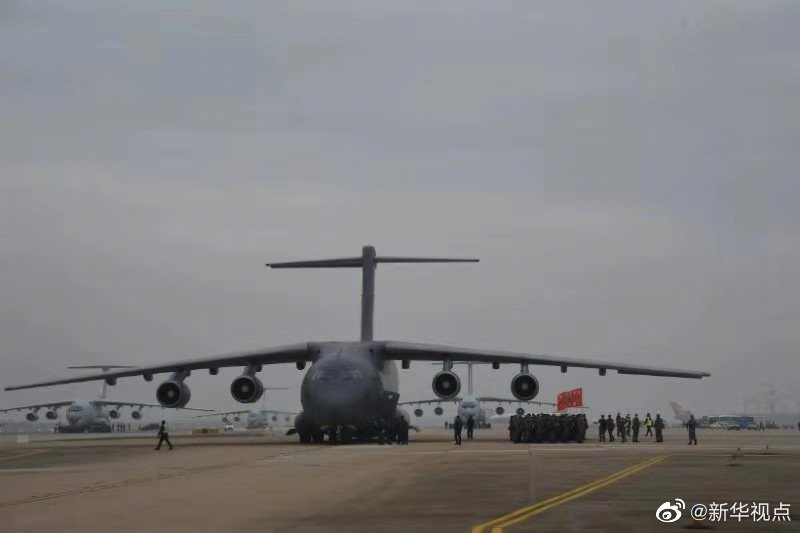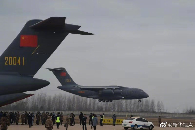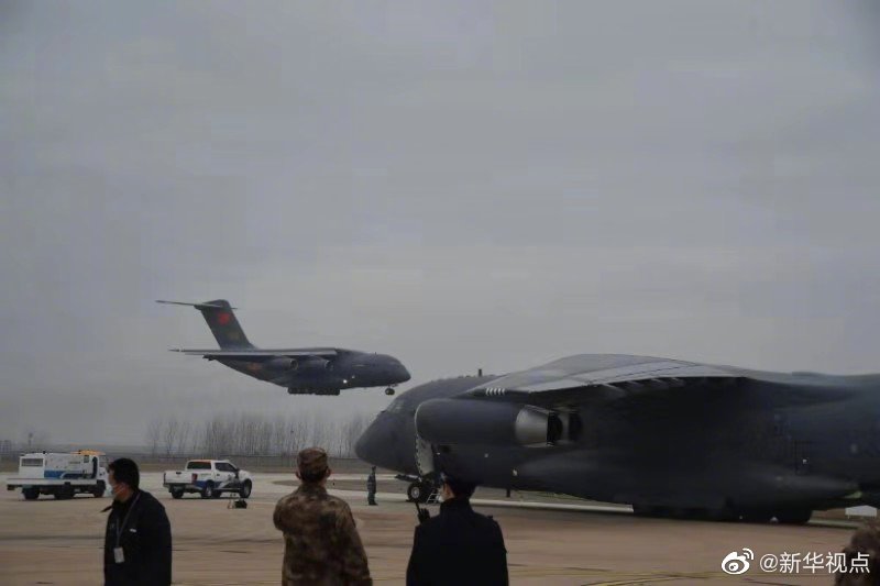 軍隊增派2600名醫護人員支援武漢抗擊新冠肺炎疫情。國產大型運輸機運-20“胖妞”首次參加非戰爭軍事行動。13日,空軍出動3型11架運輸機多地同步向武漢空運醫療隊員抵達武漢天河機場。(新華社記者黎云攝) ????