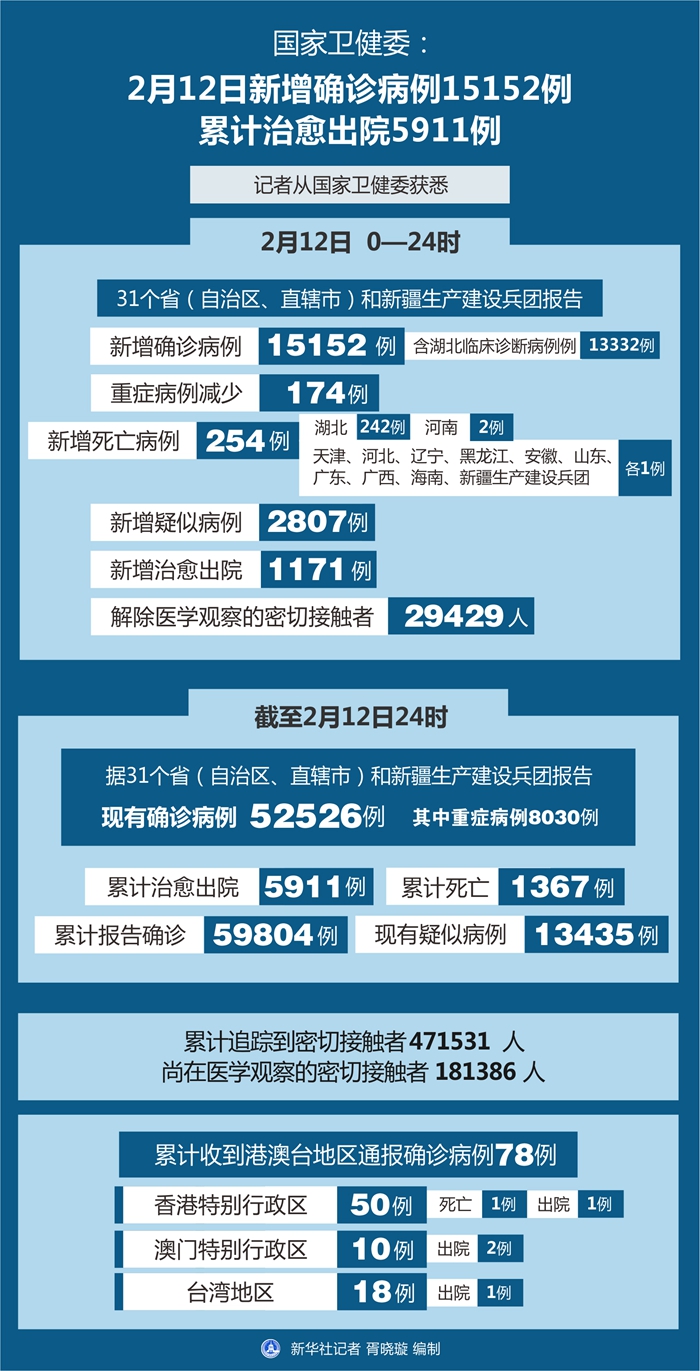 截至2月12日24時,據(jù)31個省(自治區(qū)、直轄市)和新疆生產(chǎn)建設(shè)兵團報告,現(xiàn)有確診病例52526例(其中重癥病例8030例),累計治愈出院病例5911例,累計死亡病例1367例,累計報告確診病例59804例,現(xiàn)有疑似病例13435例。累計追蹤到密切接觸者471531人,尚在醫(yī)學觀察的密切接觸者181386人。