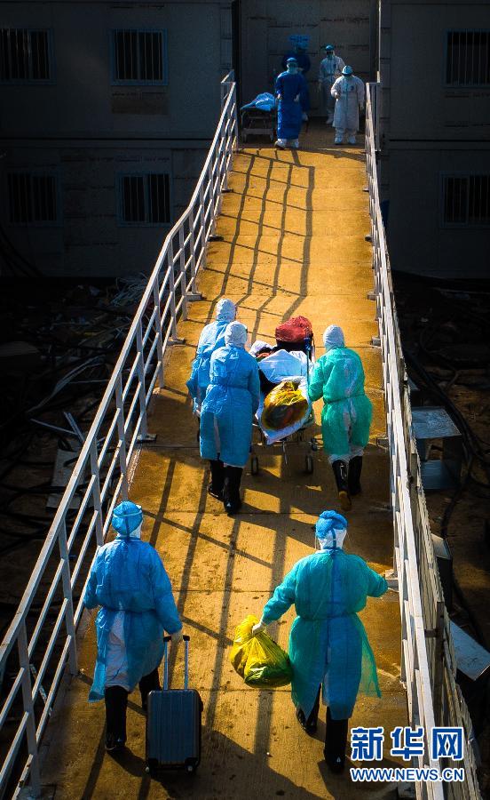 1月24日,武漢大學中南醫(yī)院重癥隔離病房的醫(yī)護人員將一名好轉(zhuǎn)的病人轉(zhuǎn)移至普通隔離病房。 新華社記者 熊琦 攝