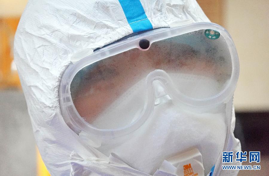 1月29日,北京宣武醫(yī)院一名醫(yī)護人員在武漢駐地練習防護技能時護目鏡內(nèi)充滿霧氣。 新華社記者 才揚 攝