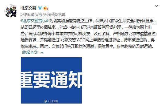 警方提醒,請擬駕駛外埠小客車來京的司機朋友,及時了解、嚴格遵守北京市疫情管控通告要求,并提前通過“北京交警”APP網上申請辦理進京證,待審核通過后,再駕車來京。同時,交管部門將開辟綠色通道,保障民生、應急物資的及時運輸。