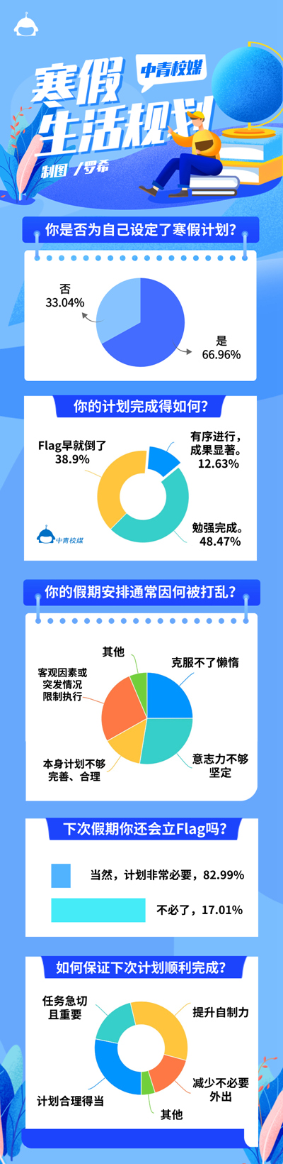 中青校媒調查顯示,在落實假期計劃時,意志力不夠堅定(63.19%)、客觀因素或者突發情況(62.36%)、克服不了懶惰(57.88%)、計劃本身不夠合理(33.06%) 等因素都會干擾計劃的執行。