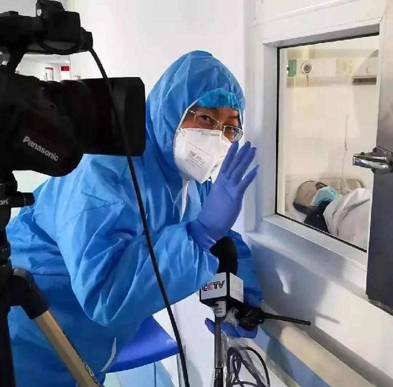 中央廣播電視總臺記者蔣曉平在武漢市金銀潭醫(yī)院采訪。