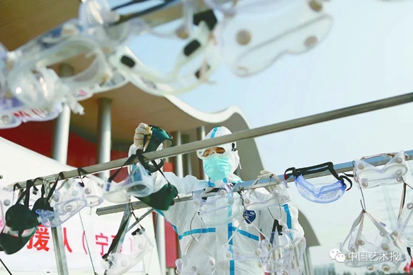 2月22日,武漢市武漢客廳方艙醫(yī)院外,援鄂醫(yī)療隊(duì)工作人員清潔護(hù)目鏡。 中國攝協(xié)赴湖北抗擊疫情攝影小分隊(duì)?李舸 攝