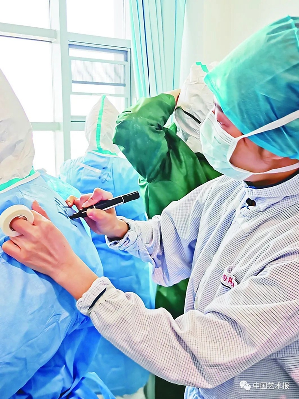 2月22日,武漢華中科技大學(xué)同濟(jì)醫(yī)學(xué)院附屬同濟(jì)醫(yī)院中法新城院區(qū),北京醫(yī)院國家醫(yī)療隊(duì)負(fù)責(zé)的病區(qū)。醫(yī)護(hù)人員在防護(hù)服上寫下姓名,整裝待發(fā)。中國攝協(xié)赴湖北抗擊疫情攝影小分隊(duì) 陳黎明 攝