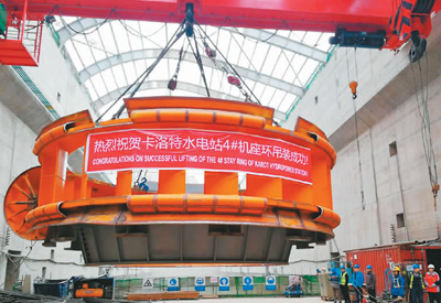 “中巴經(jīng)濟(jì)走廊”優(yōu)先實施項目巴基斯坦卡洛特水電站最后一套座環(huán)、基礎(chǔ)環(huán)成功吊裝。三峽集團(tuán)供圖