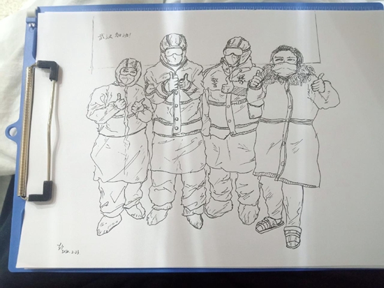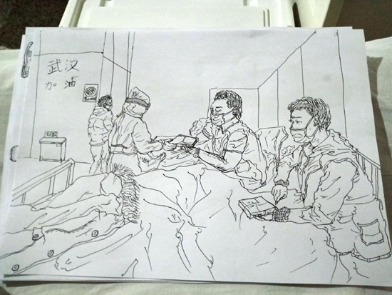 他把畫的“方艙生活”發(fā)到了微博上——兩位病人在床,護士俯身照顧。畫中醫(yī)院的墻上被他特意寫了四個字:“武漢加油。”(程盟超)