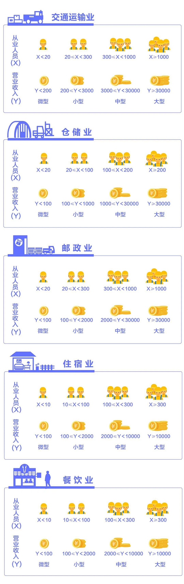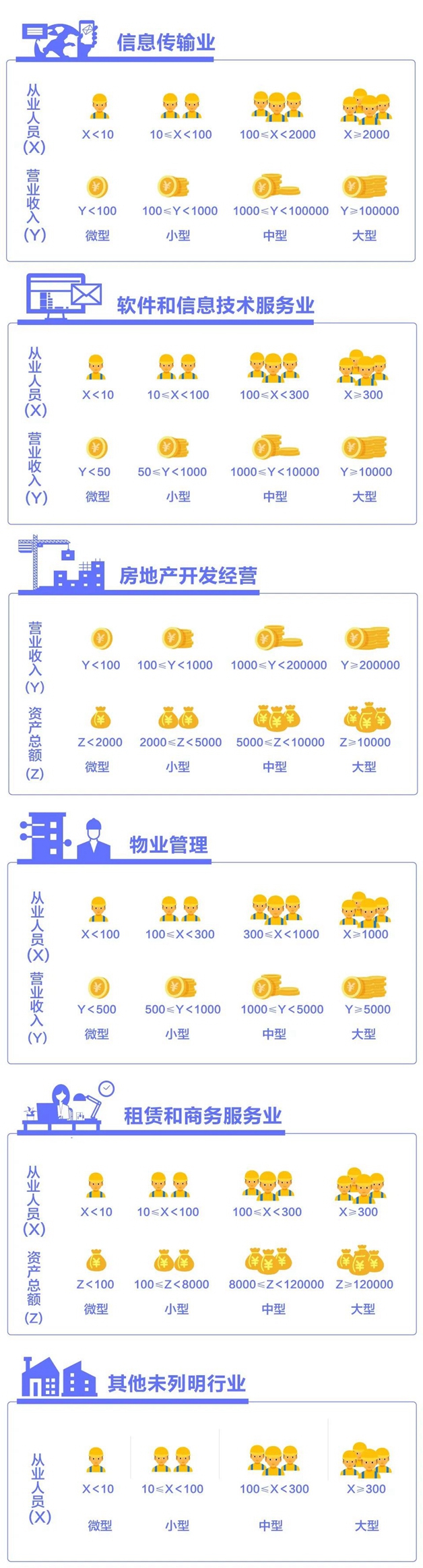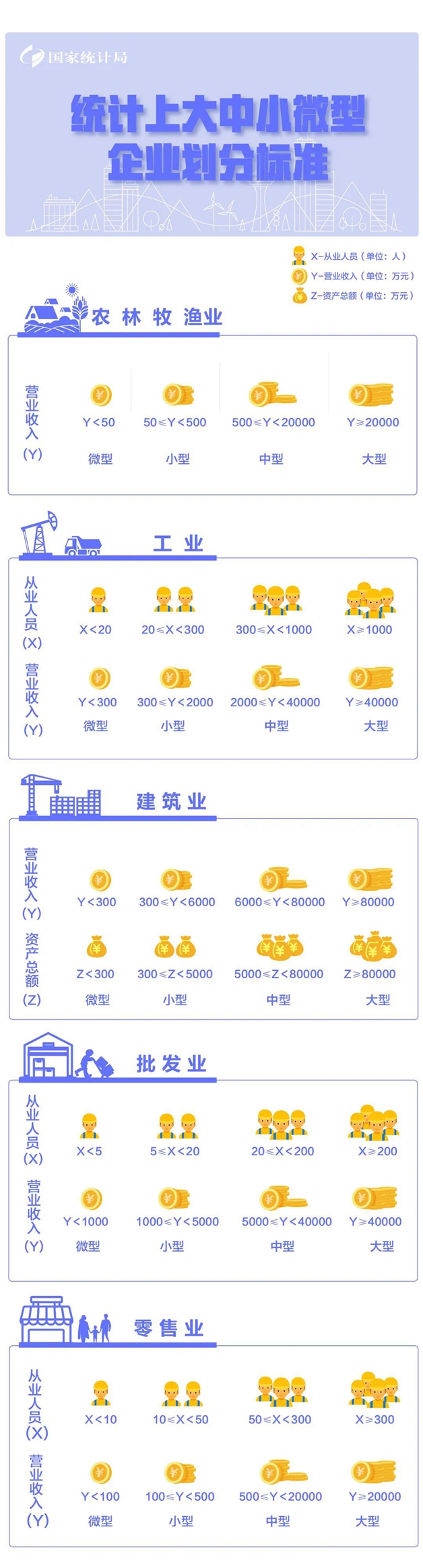 該辦法按照行業(yè)門(mén)類(lèi)、大類(lèi)、中類(lèi)和組合類(lèi)別,依據(jù)從業(yè)人員、營(yíng)業(yè)收入、資產(chǎn)總額等指標(biāo)或替代指標(biāo),將我國(guó)的企業(yè)劃分為大型、中型、小型、微型等四種類(lèi)型。