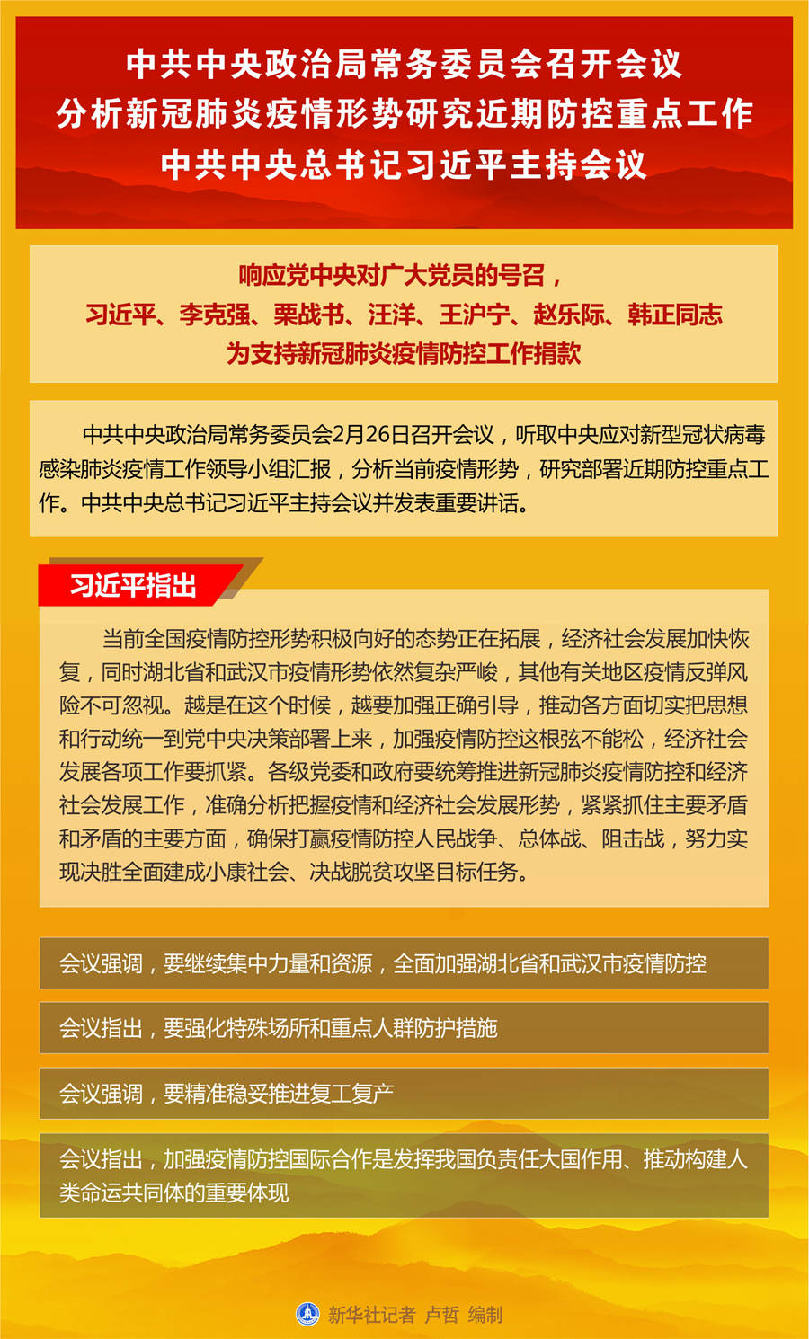新華社北京2月26日電 中共中央政治局常務(wù)委員會(huì)2月26日召開(kāi)會(huì)議,聽(tīng)取中央應(yīng)對(duì)新型冠狀病毒感染肺炎疫情工作領(lǐng)導(dǎo)小組匯報(bào),分析當(dāng)前疫情形勢(shì),研究部署近期防控重點(diǎn)工作。中共中央總書(shū)記習(xí)近平主持會(huì)議并發(fā)表重要講話。