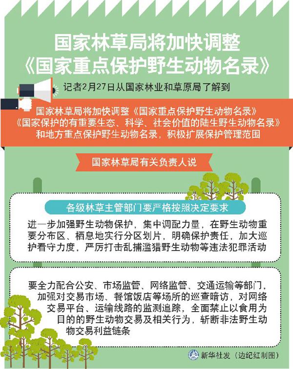 新華社北京2月27日電(記者胡璐)記者27日從國家林業(yè)和草原局了解到,國家林草局將加快調整《國家重點保護野生動物名錄》《國家保護的有重要生態(tài)、科學、社會價值的陸生野生動物名錄》和地方重點保護野生動物名錄,積極擴展保護管理范圍。
