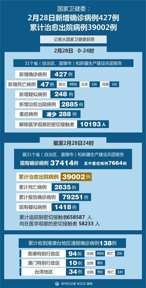 國家衛健委:2月28日新增確診病例427例 累計治愈出院病例39002例-新華網
