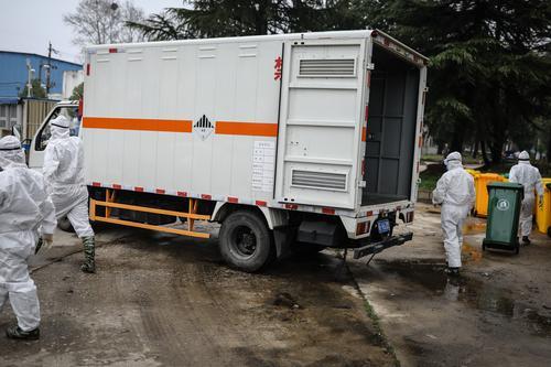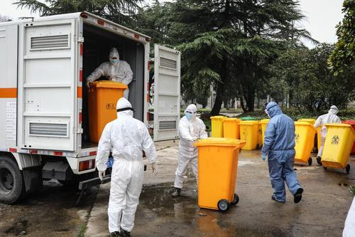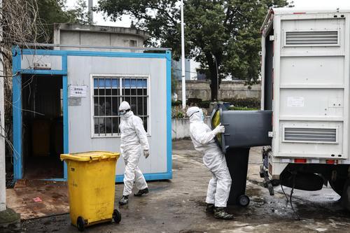 2月26日,湖北省武漢市,幾名醫療廢物處理員在搬運醫療垃圾。中青報·中青網記者 趙迪/攝