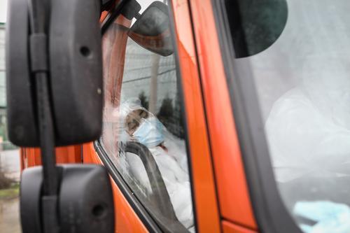 2月26日,湖北省武漢市,準備進入醫療垃圾焚燒場時,正在等待的醫療垃圾搬運員。中青報·中青網記者 趙迪/攝