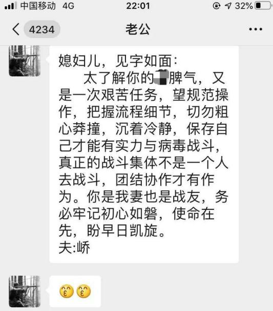 軍隊支援湖北醫療隊隊員彭渝瞞著家人馳援武漢,丈夫直到看見別人發的照片,才知道她已經出發。兩人在電話里大吵一架,冷靜之后,同為軍人的丈夫給彭渝發了一條微信“你是我妻也是戰友,盼凱旋!”看到微信,彭渝落淚……
