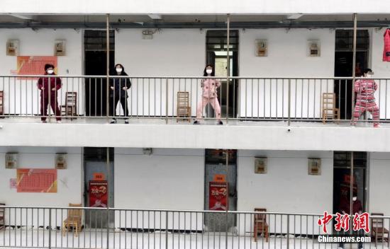 29日中午,作為康復期患者隔離點的武漢軟件工程職業學院5棟宿舍樓響起了音樂,人們戴上口罩走出房門,站在“口”字型走廊上練起八段錦和太極拳。