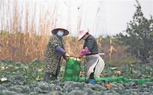 2月26日,湖北黃岡市黃州區(qū)路口鎮(zhèn)夾洲村,豐實(shí)蔬菜種植專(zhuān)業(yè)合作社的社員正在收蔬菜。本報(bào)記者 高興貴攝