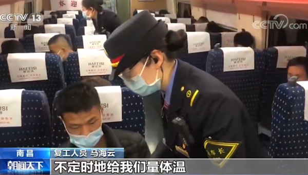 復(fù)工人員 馬海云:這一趟列車是(政府)給我們免費(fèi)提供的,沒(méi)有掏一毛錢的票錢,然后列車不定時(shí)地在里面消毒,不定時(shí)地給我們量體溫,衛(wèi)生環(huán)境也很好,搞得很干凈。