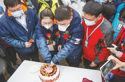 雷神山醫院院方得知這對“95后”新人的情況后,為他們倆舉行了這場“戰地婚禮”。(姜泓冰、張赫、葉佳琪、莫佳瑜 記者 張武軍攝)