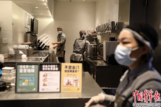 喜茶漢街LAB店和大多數店鋪一樣暫停營業了。2月22日,中青報·中青網記者實地探訪時發現,空空蕩蕩的店鋪里擺著一排排裝滿食物的紙袋,10名工作人員戴著口罩,如往常一樣在忙碌地制作奶茶和面包。