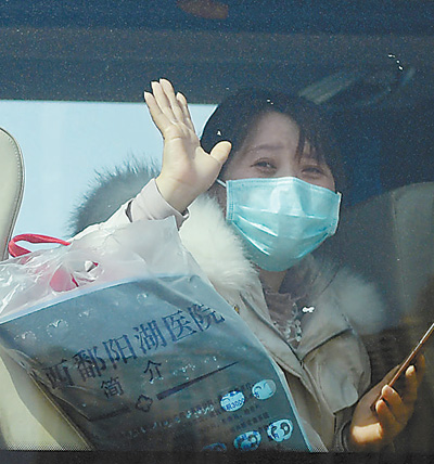 2月22日,江西中醫藥大學附屬醫院撫生院區,11名此前由其他醫療機構轉入該院的新冠肺炎患者治愈出院,其中有8人在該院接受了中醫治療,3人接受中西醫結合治療。圖為出院的病人向醫護人員揮手告別。時 雨攝(影像中國)