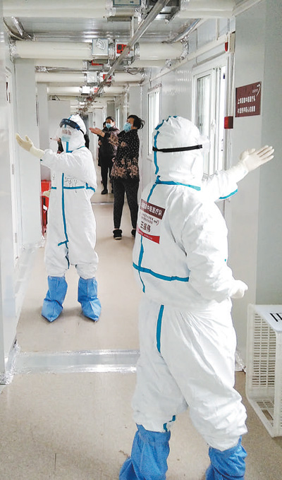 武漢雷神山醫院,上海支援湖北醫療隊的醫護人員在教患者按照“六字訣”中醫功法進行鍛煉。姜泓冰 龔亞斌攝影報道